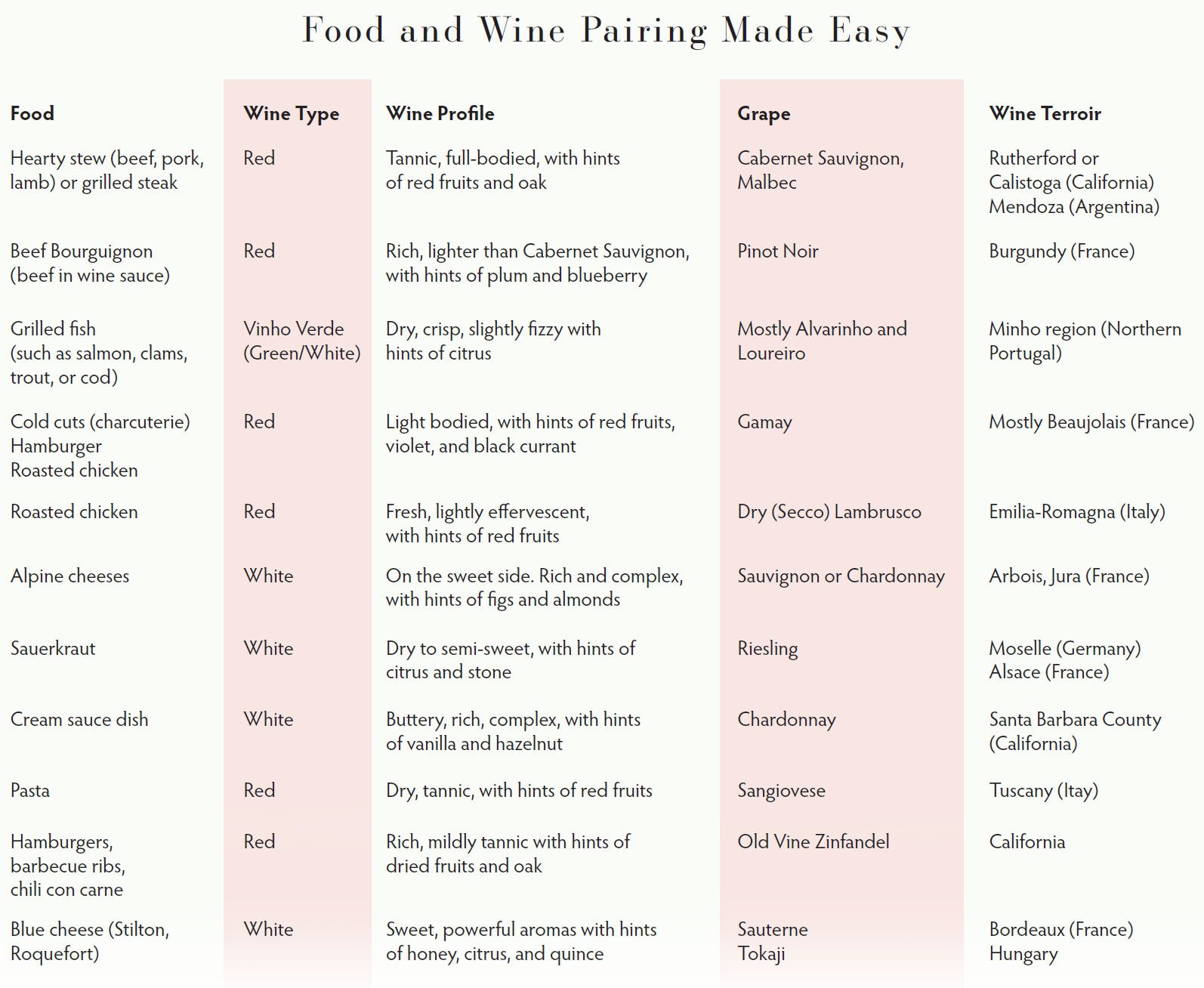 In general, a simple rule of thumb is that white wines pair best with light-intensity meats (such as fish or chicken) and full-bodied red wines are best balanced with heavier, fattier meats (such as beef or game). But here I will discuss some other options and offer simple guidelines for perfect pairings that will make your next meal memorable.