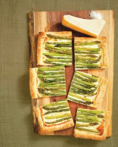 This is adapted from a recipe by Melissa Clark that ran in The New York Times. It looks fussy, but it’s very easy to do. Work as quickly as you can with puff pastry. If it gets warm, simply pop it, still on the cutting board, into the fridge. For this recipe, I always snap off the asparagus ends where they break most evenly, ensuring all spears are tender.