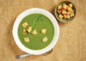 Asparagus and Spinach Soup with Rosemary-Parmesan Croutons