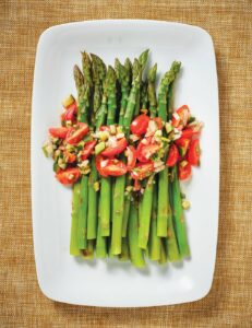 Pretty as a picture, look for vine-ripened grape or cherry tomatoes as they’ll have a sweeter flavor. Baby San Marzanos are good, too. If you’d like, cook the asparagus earlier in the day and refrigerate until ready to make the vinaigrette and serve.