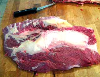 In many ways the brisket is the best cut by which to judge a beef. One the first things a good butcher looks at when he gets an animal in is the deckle—the fatty edge of the brisket—which shows what the marbling will be like throughout the animal. When Jake cuts a brisket at The Meat Market, he likes to leave most of that fat on. (As many seasoned butchers will tell you, you can always trim fat away but you can’t add more later.) This layer of fat helps the brisket to cook better and keeps it from drying out. As it slowly melts into the meat, the brisket is basted naturally and kept moist and tasty.