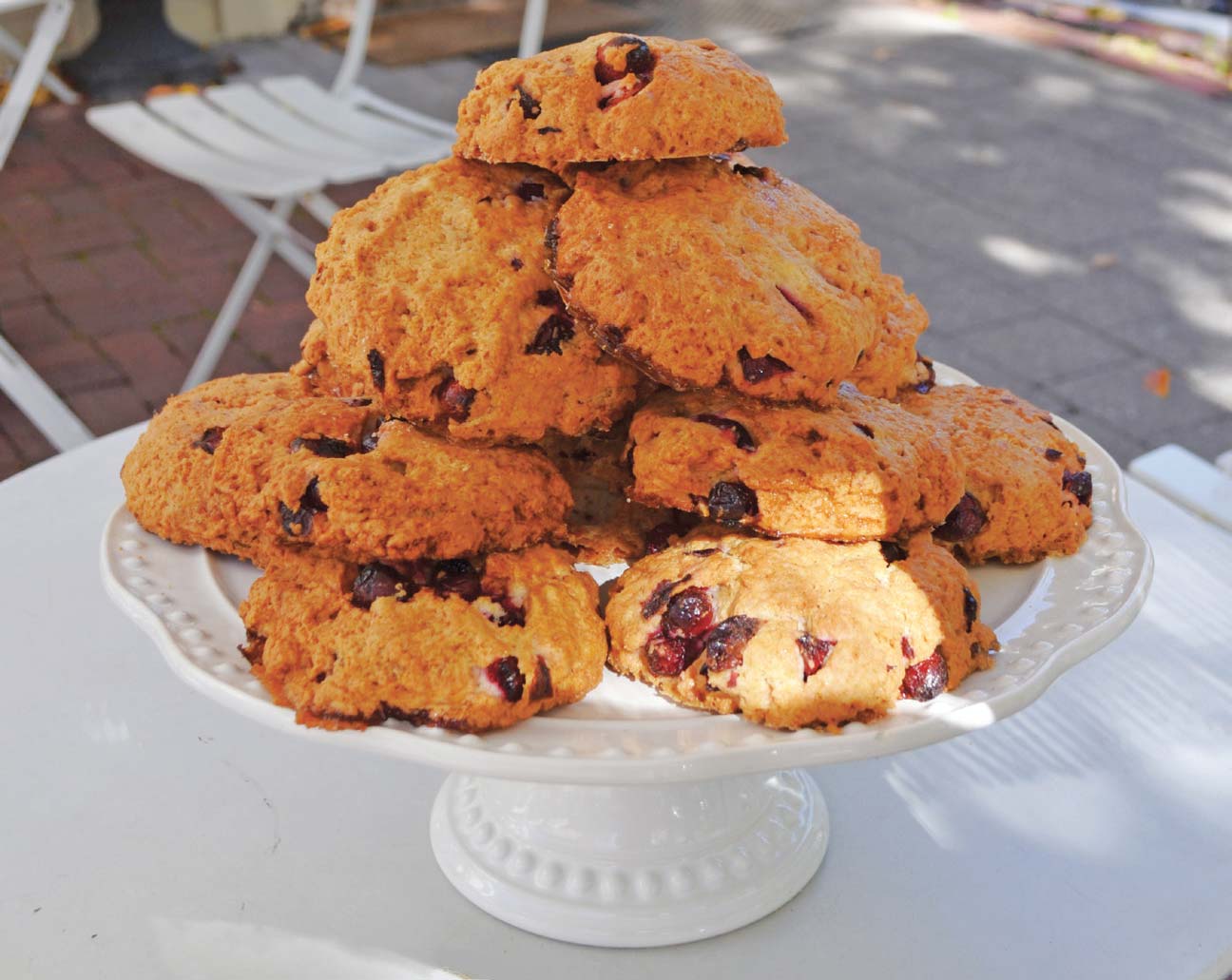 Chill the butter instead of softening it and chop it into 1-inch cubes. Using all-purpose flour instead of the gluten-free option, combine all dry ingredients with cubed butter in a mixer fitted with the paddle attachment and mix on low until the butter is the size of peas. Then add the cream, cranberries and ginger and mix until combined. Follow the rest of the instructions as written, and enjoy!