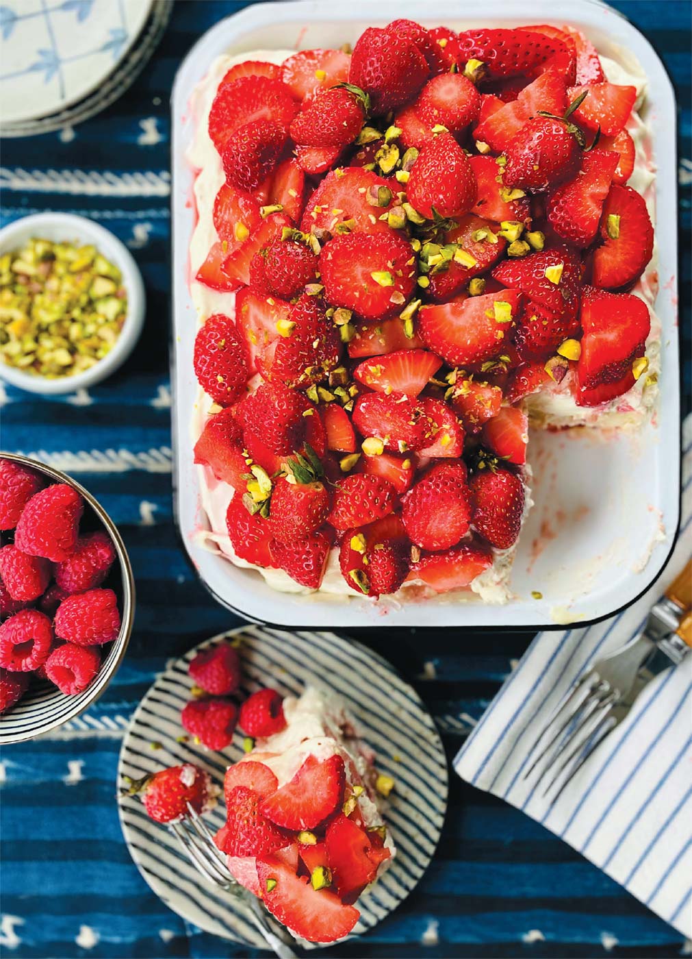 - When ready to serve, stem and slice the reserved strawberries. Arrange them over the tiramisu, overlapping the slices, then scatter with the pistachios and a handful of raspberries if desired. Cut into squares—or scoop out with a large metal spoon.