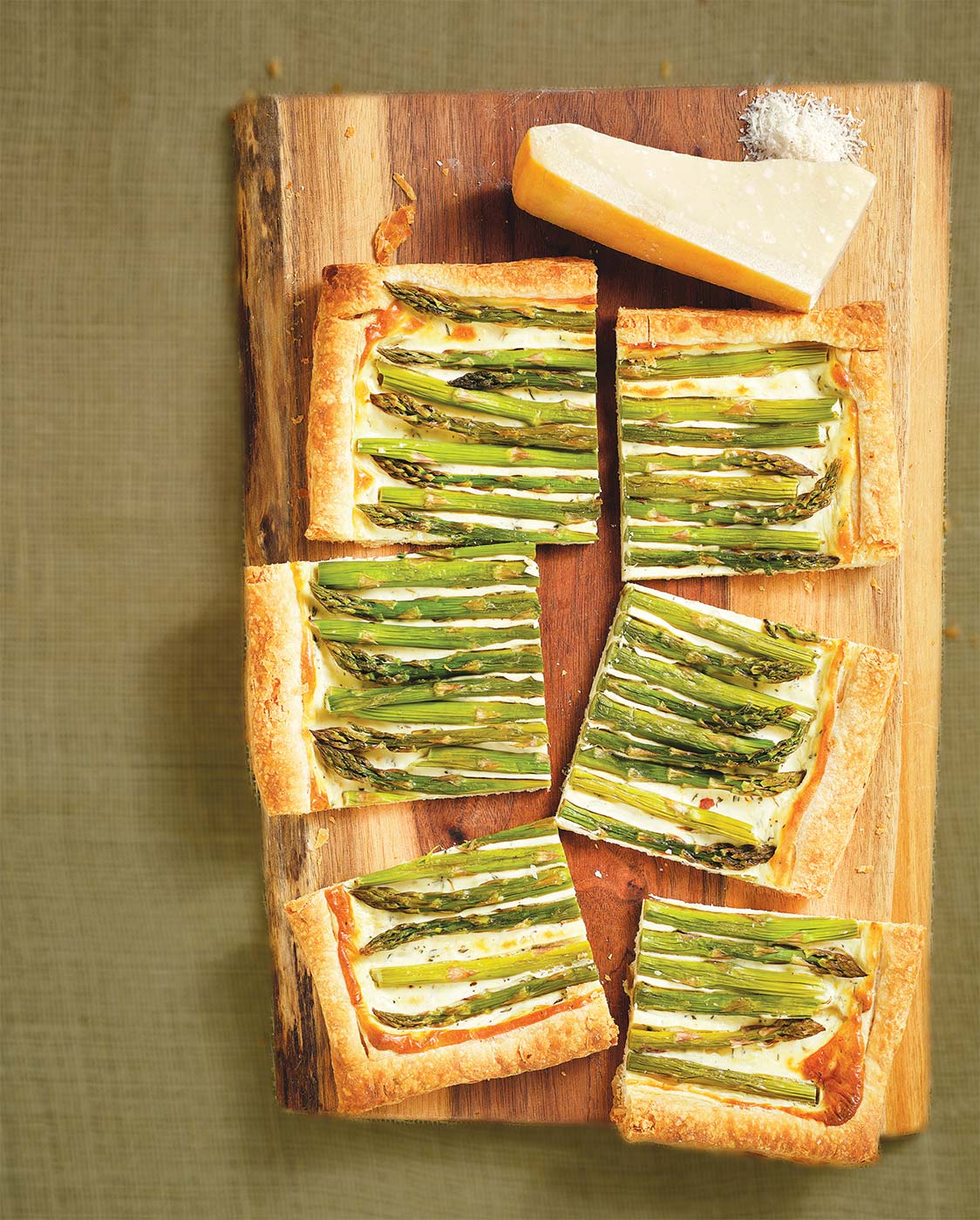 - Spread the cheese mixture evenly inside the border. Line up the asparagus over the cheese, alternating ends and tips, and brush lightly with olive oil. Sprinkle with salt.