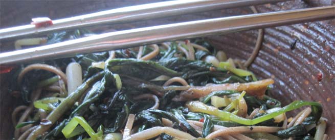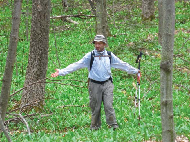 The next spring I made a trip into the woods to see if i could fi nd a patch where i might dig a few of my own. ramps reproduce poorly by seed and slowly by bulb division, requiring an estimated 10 years to recover after the 10% harvest of a patch. given their long-standing popularity in southern Appalachia, this means that ramp patches are few and far between there. i was gob smacked at the ease with which i was able to fi nd them in the woods of Berkshire County on that initial outing and ever since. i have been able to gather enough to branch out beyond scrambled eggs and fried potatoes. i learned that ramps stir-fry nicely, and have become especially fond of them in combination with soba, soy sauce and some red pepper flakes.